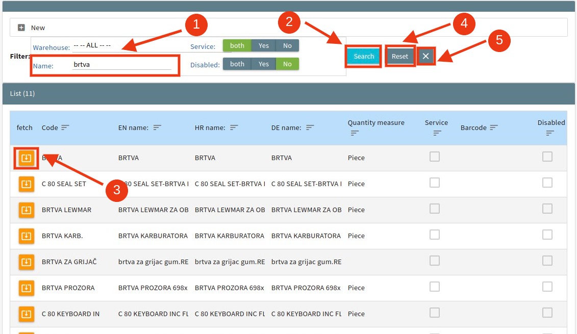 Another window (picture 27) will display in which you can search for the needed product/service. In the Name (1) text box simply start typing the name of the product and click Search (2). In the results list, choose the desired product by clicking on the Fetch (3) button.