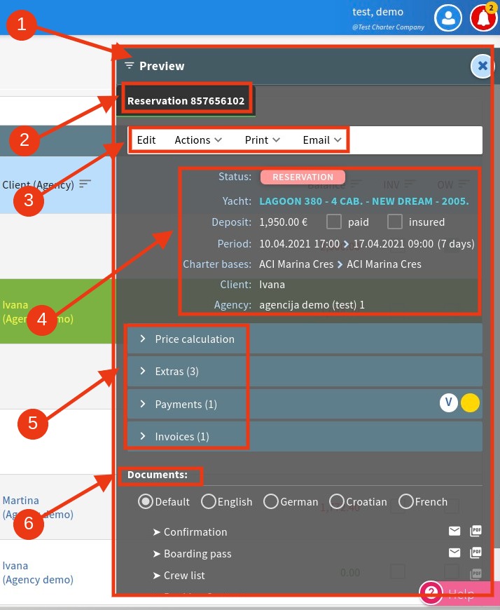 The menu bar (3) on the preview pane, allows you to edit and do certain actions considering a selected reservation.